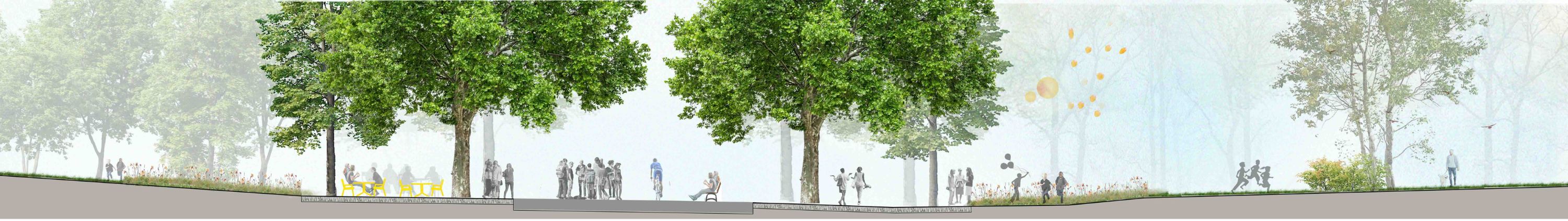 The restored Grand Centre Walk will provide more space for events, such as the weekly market, and offer shaded seating beneath the tree canopies.